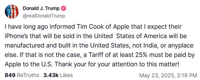 Apple is once again under pressure from former U.S. President Donald Trump, who says iPhones sold in America should be made in America. On his platform, Truth Social, Trump warned that a 25% tariff may be imposed on iPhones not made in the U.S.