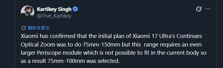 According to well‑known leaker Kartikey Singh, Xiaomi originally planned a zoom range of 75mm to 150mm for the 17 Ultra. This would have given users a powerful telephoto reach. However, the design required a much larger periscope module, which simply didn’t fit into the slim smartphone body.